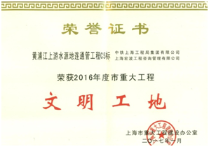 近日,從上海市重大工程建設(shè)辦公室傳來佳訊,由公司承建的上海黃浦江上游水源地連通管工程C5標項目榮獲上海市“2016年度重大工程文明工地”稱號,為公司再添榮譽。